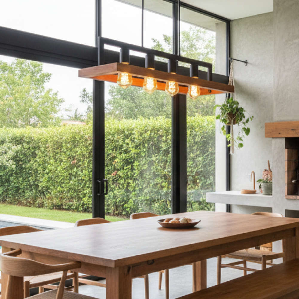 Colgante industrial madera hierro negro 115 woody 4 luces e27